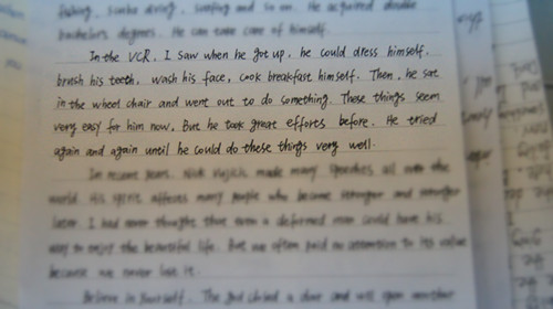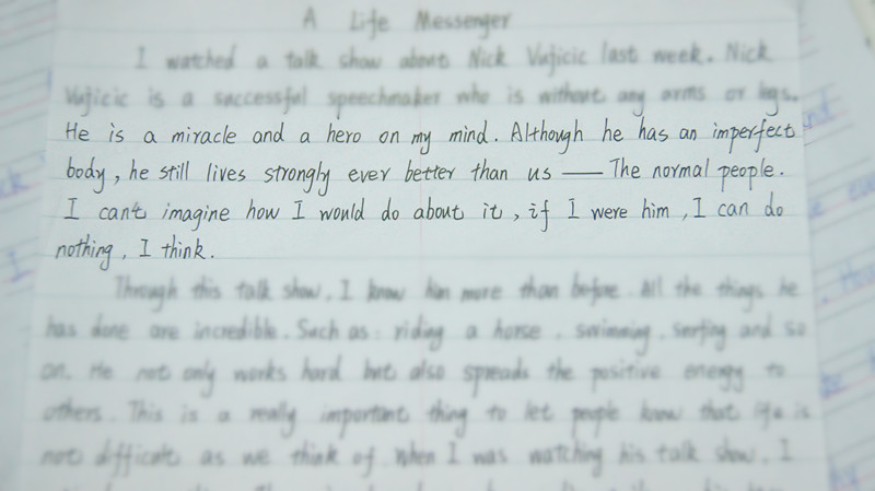 影片的中的尼克•胡哲,在学生笔下缓缓画出了轮廓,一字一句的单词砌成他足够让人敬佩的形象。“I saw when he got up ,he could dress himself,brush his face ,cook breakfast himself ,Then ,he sat in the wheel chair and went out to do something .These things seem very easy for him now .But he took grest efforts before .He tried again and again until he could do these things very well.”(Fairy)