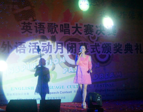 作为本次英语歌唱大赛的导师Celia身穿一袭桃红蕾丝连衣群,优雅端庄,美美哒。为小伙伴们倾情演唱taylor swift的《love story》,把晚会的氛围推向了又一高潮。