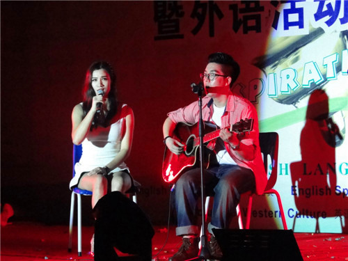 英语82班 陈小东,万亚楠,Don,Bree 男女吉他弹唱《duet》,默契配合,完美CP即视感,当之无愧地荣获二等奖,并且以4275票荣登英语歌唱大赛最佳人气的宝座。