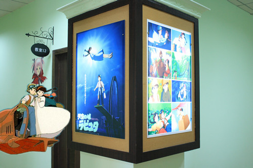 在iBS金鼎校区里,处处都是充满着宫崎骏的动画。穿过长长的走廊像是过时空隧道,进入到宫崎骏的动画世界,龙猫、千寻、希达等卡通人物出现在你眼前。无论是在走廊的墙壁上还是拐角处的壁灯上,都在描写着宫崎骏未说完的故事。