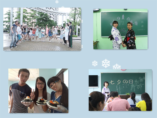 在IBS金鼎校区,时不时都会举办与日本文化相关的活动,例如,日本七夕节祈福活动、和服风情、包寿司活动等等,让学生不仅能够感受到日本的文化风情,也能学到日语知识。