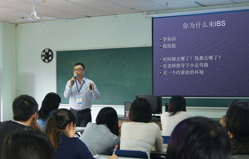 宋键校长一上台就与同学们进行互动交流,幽默亲切的开场一下子拉近了与同学们的距离,“是什么促使你最终选择iBS,把未来十个月的时间成本放在iBS?”现场的同学们纷纷从学校的环境、教学体系、课程产品等方面回答了宋校长提出的问题。宋键校长说:“无论你何种缘由选择我们,iBS都会把品质教学、特色课程和高效管理呈现给同学们。”此外,他还用PPT的形式与大家分享了他自己学英语的心得,并衷心祝愿同学们在iBS学有所成,开心快乐。