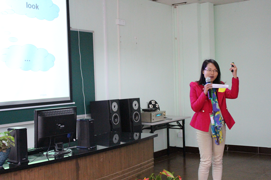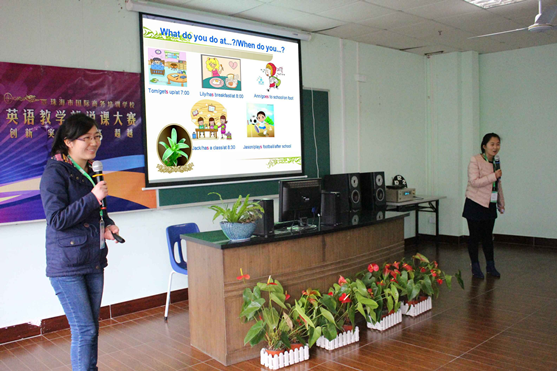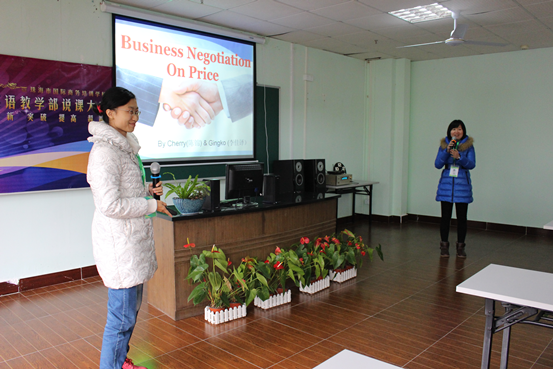 无论是从说课稿的撰写还是PPT的演示都做足了功夫,不仅如此教师们还结合多媒体辅助,提升说课效果。说课过程中,教师们都各显其能,声情并茂,除了PPT演示,还有加入歌曲、动作、角色扮演等元素,赢得了评委和观众阵阵掌声。商务组的“有缘人组合”Cherry和Gingko是唯一一组采用商务课题。两个人一个扮演买方,一个扮演卖方,逼真再现商务实战。她们说得抑扬顿挫,教材处理得别具一格,展示出良好的语言功底和扎实的教学功底。