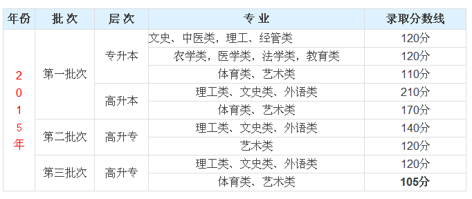 2015年广东省各类成人高等学校招生各批次录取最低控制分数线(文化课总分)如下: