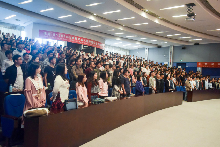 14:30,来自英语主校区、金鼎及小语种校区的450余名新生已经集合完毕,准备好开始一场专属于他们的外语学习的“开幕式”。开学典礼在激昂雄壮的国歌声中开始,iBS师生及到场嘉宾全体起立,随着音乐默唱。