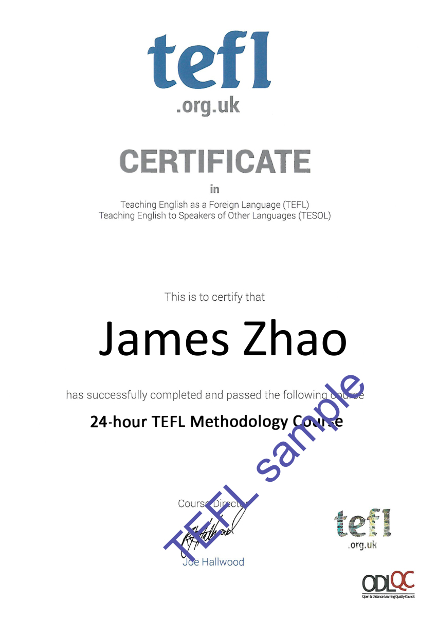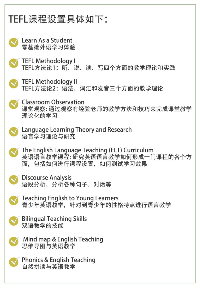 TEFL(Teaching English as a Foreign Language,即将英语作为外语来教授)是世界广泛采用的针对母语为非英语人士的英语教学体系,涵盖从理论到实践,从基础教学到专门英语教学的各个方面。TEFL课程是专门为英语为非母语的英语老师特别设计的师资训练及指导课程。学员成功通过TEFL课程的学习,即可获得TEFL证书。TEFL证书的实用性和权威性在世界范围内得到充分认可,全球80多个国家和地区的国际学校以及英语教育机构都认可TEFL证书,TEFL是全球公认的国际教师职业资格证书,其学术水准代表了英语教学技能的国际水准。拥有TEFL,即拥有了在世界各国从事以英语为外语的教学的资格,能够直接进入国际职业市场,就业前景非常广阔。