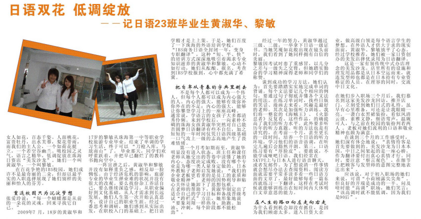 珠海日语培训学校。“IBS商务日语全封闭一年,变身专职翻译”,这种“短、平、快”的培训方式深深地吸引着渴求专业知识滋养的黄淑华和黎敏。心动不如行动,她们从酝酿、报名、考查到IBS