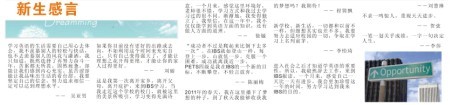 这是我第一次离开家乡,离开父母,离开庇护,来到IBS学习。当我走近这个学校的校门,就被这里的美景所吸引,学习变得充满诗意。一个月来,感觉这里环境好,老师很不错,学习方式和我过去学习过的很不同。渐渐地,我变得独立了。我坚信,在这一年中,我不仅仅能学到英语方面的知识,还有做人方面的道理。 ―― 徐铖